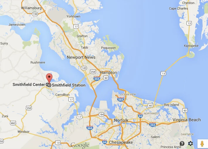Smithfield is 30-60 minutes away from the majority of Hampton Roads major cities. The closest airports are as follows: Newport News /PHF ~ 45 minutes, Norfolk/ORF ~ 60 minutes, Richmond/RIC ~ 90 minutes.